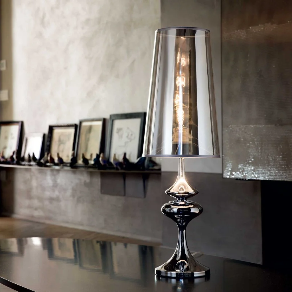 Chrome metal base. Chrome semi-transparent fireproof PVC foil shade.