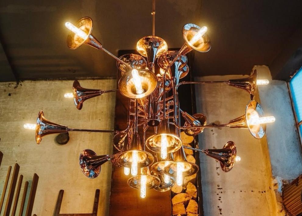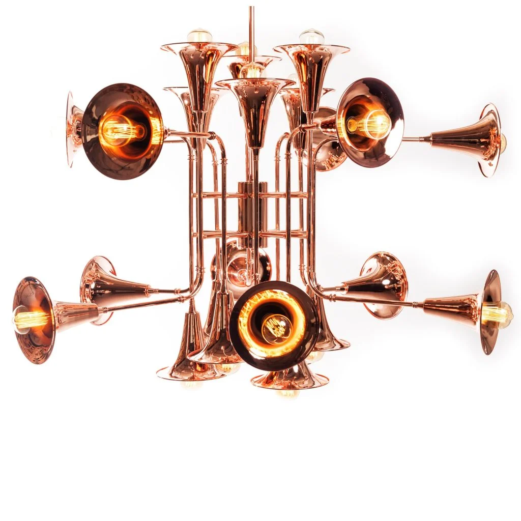 Modern suspension light with 24 lights. The metal parts are made of brass. It is combined with Edison lamps. It can come out with more or less lights, as well as in any color.